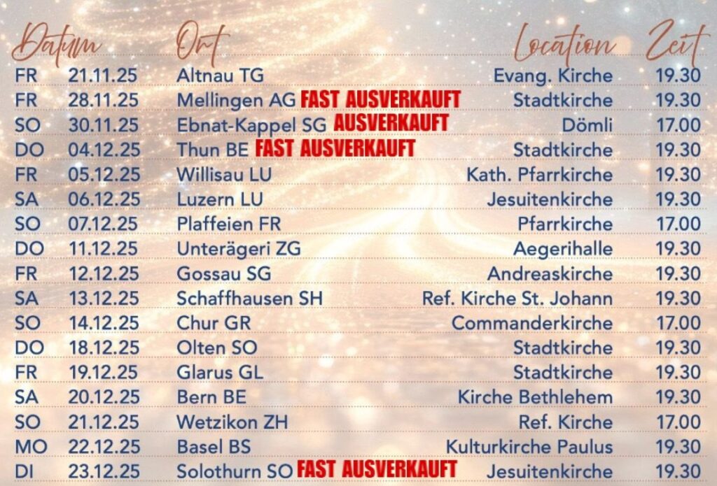 | 22.12.2026 | SWISSMAS - Weihnachtstournee 2026 Solothurn SO · St. Marienkirche · 19.30 Uhr (VVK: 23.12.2025) |